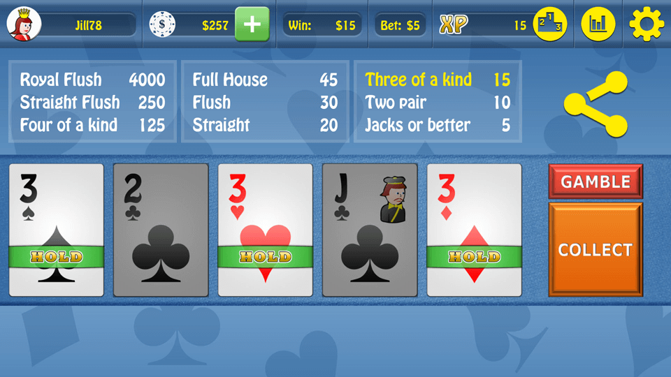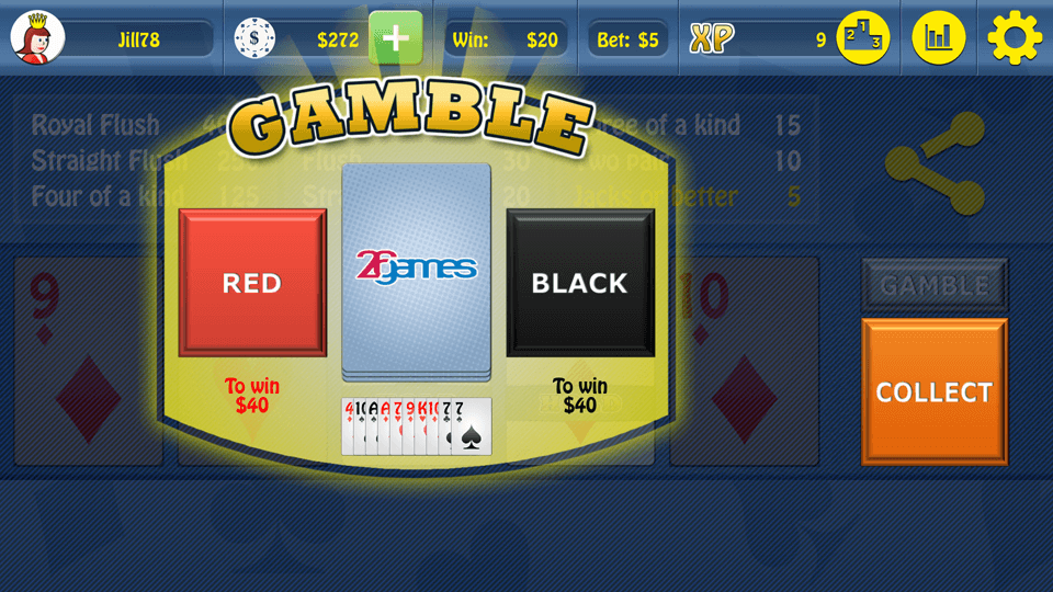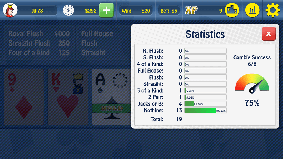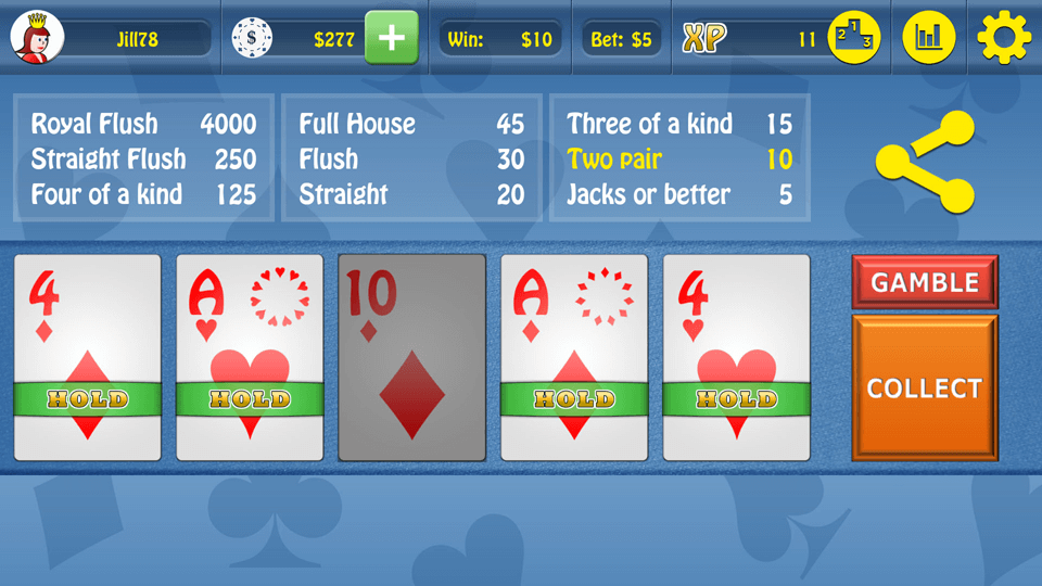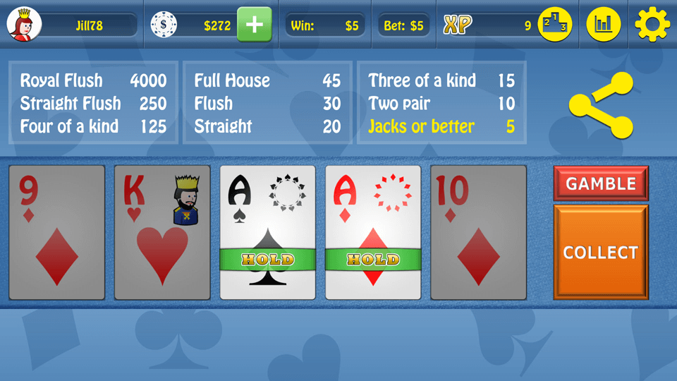 Play Jacks or Better - Video Poker and compete with people all around the world by collecting XP points. The application enables you to easily share games with your friends via social networks. Clear game statistics allow you to play better in the future. Find out if you played optimally or you made a mistake. You can also use the Autohold option that freezes cards using optimal strategy.